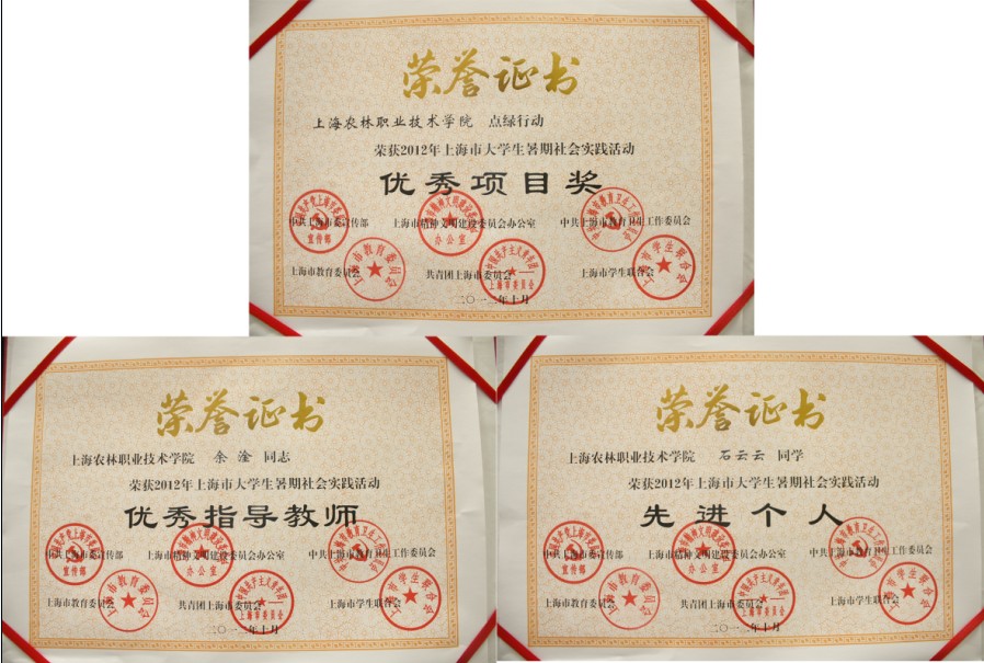 此外,园艺园林系余淦老师荣获“2012年上海市大学生暑期社会实践活动优秀指导教师”称号,园艺园林系环艺101班石云云同学荣获“2012年上海市大学生暑期社会实践活动先进个人”称号。