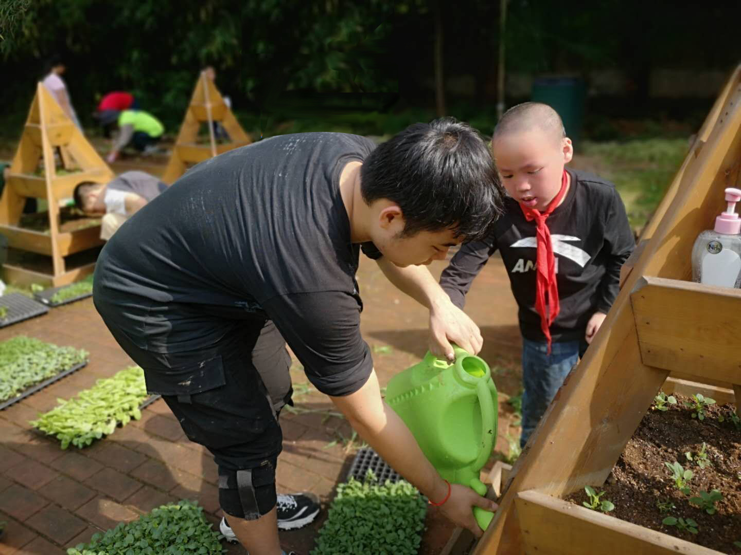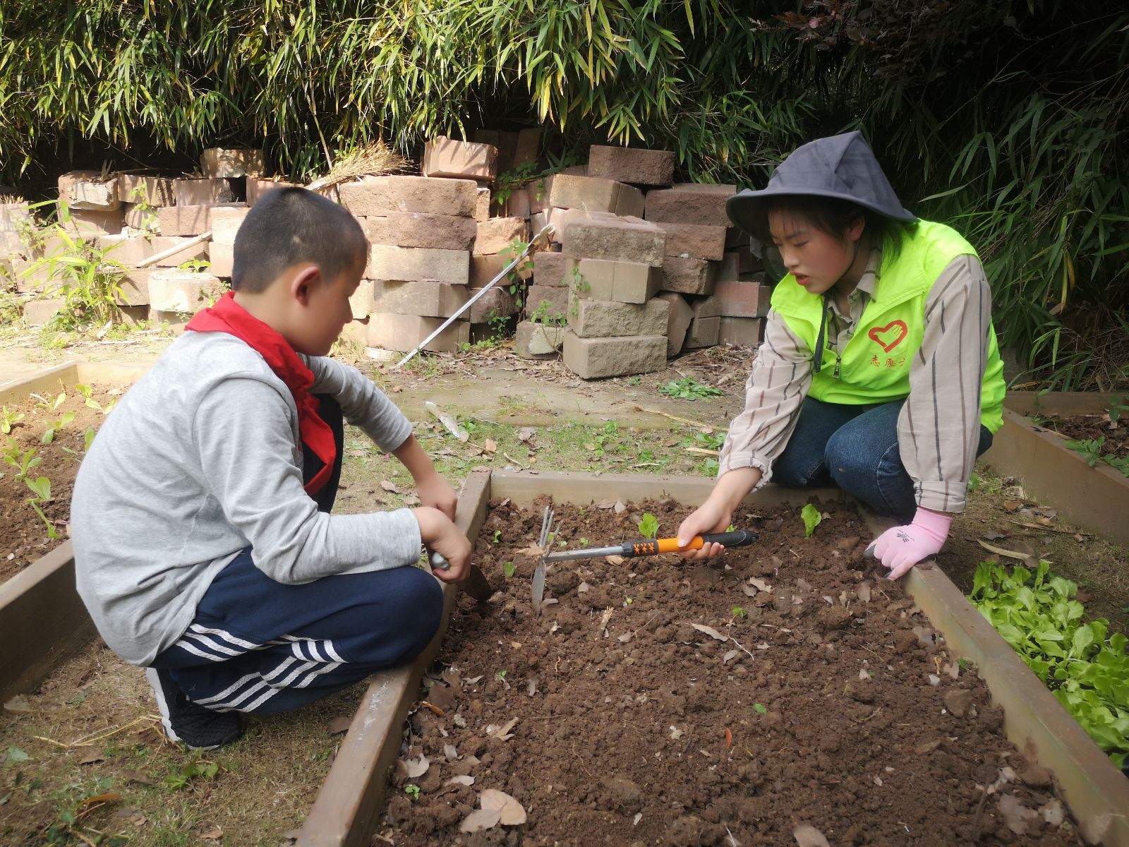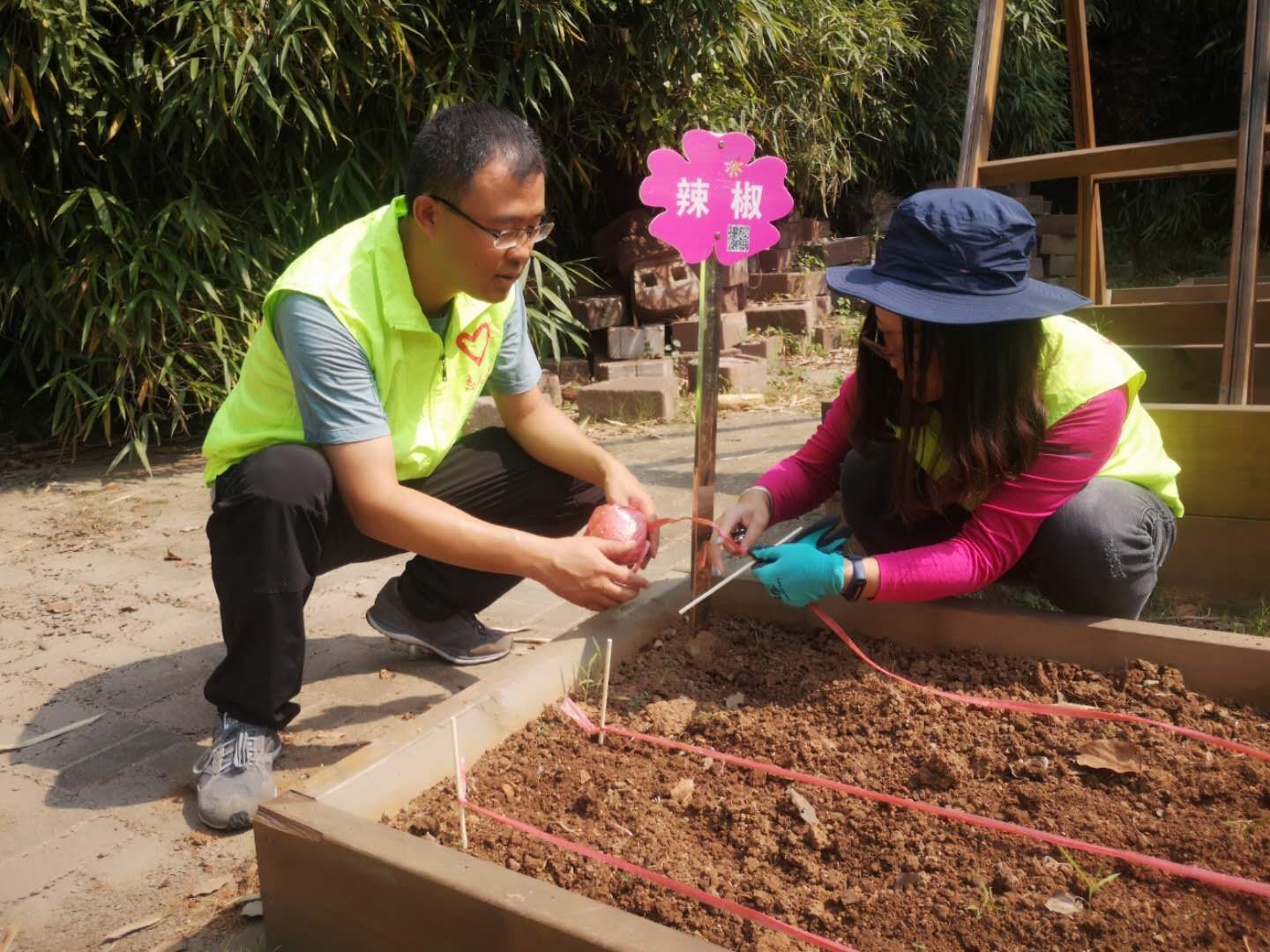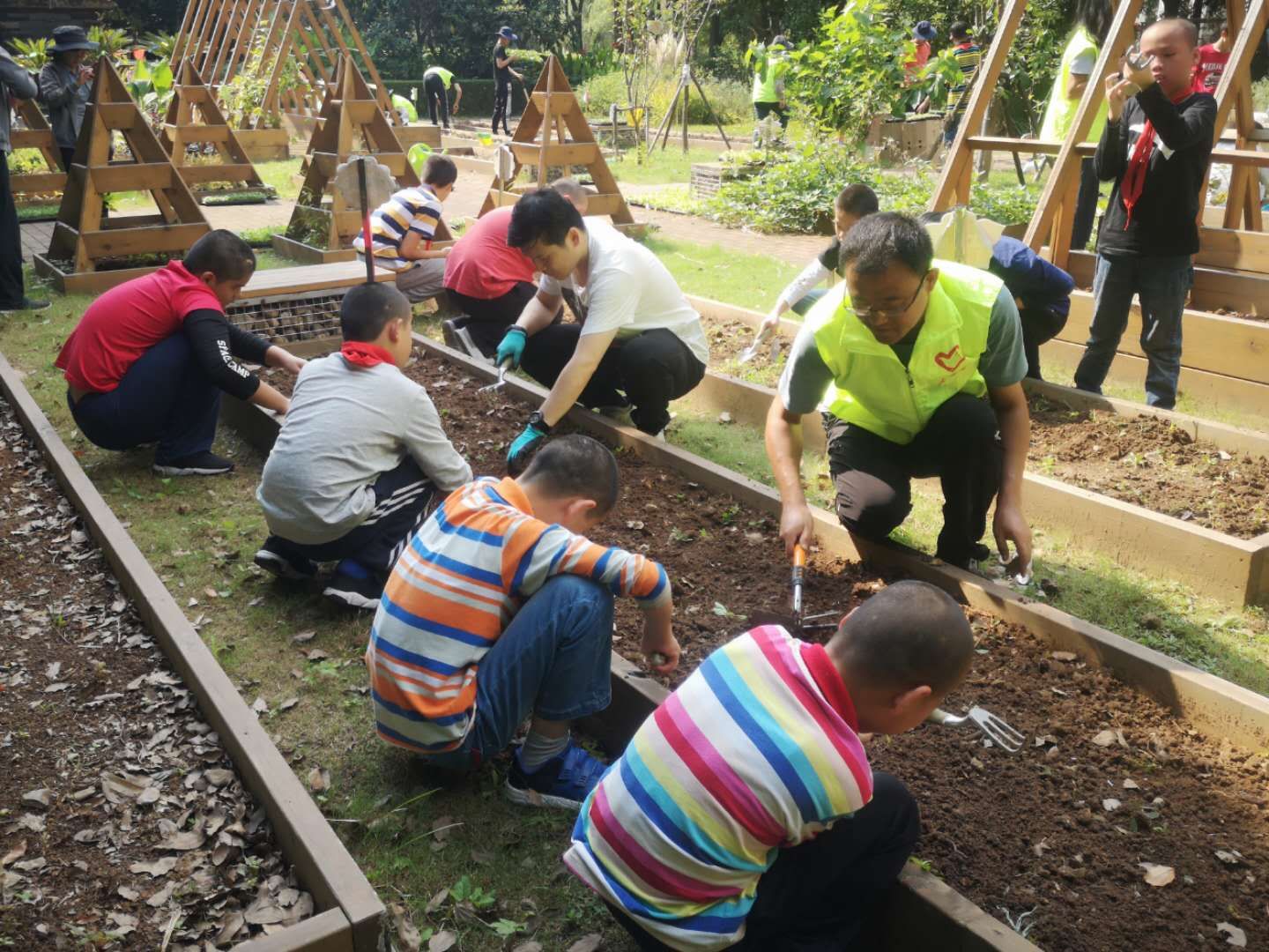 活动中,党员老师们首先给儿福院的社工和小朋友们讲解了对开心农场种植的整体规划,并对园艺种植过程中的技巧、要领进行了实践指导和示范操作。大家根据事先的分组,分工劳动,整地、定距、挖坑、种植、浇水,一步步有条不紊的进行,农场中充满了小朋友们的欢声笑语和党员教师的耐心讲解、谆谆教导,大家尽情挥洒着汗水,体会着劳动的快乐。此次活动共帮助儿福院种植了莴笋、葡萄、韭菜、生菜、三色堇、羽衣甘蓝等10余种绿植共计600余株幼苗,完成6个种植花架、18个种植箱的花卉和蔬菜种植。党员教师们在活动中用饱满的热情,精湛的技能,将专业知识运用到整个种植过程中,普及园艺知识、诠释绿色文化魅力,并将满满的爱心投入到对儿福院小朋友的指导中,充分展现了一名教师的魅力,一名党员的责任担当。