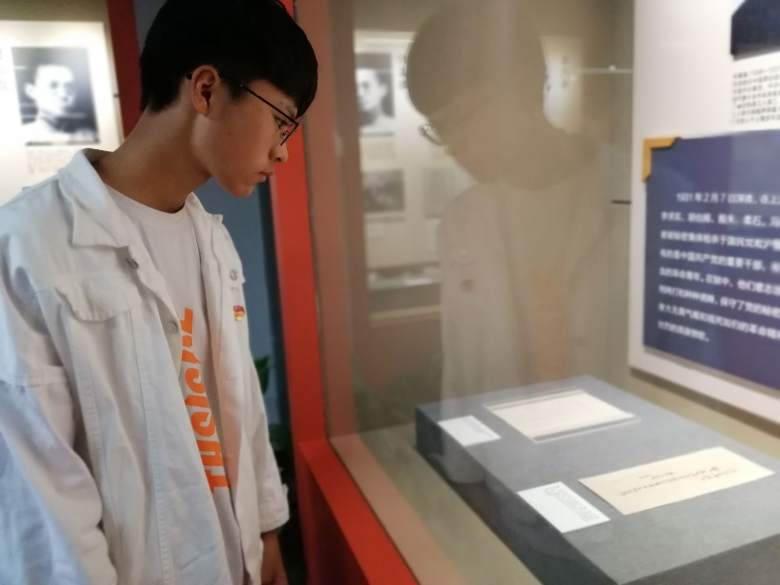 进入纪念馆,最先引入眼帘的是宣誓厅内的巨幅中国共产党党旗,党员教师们整齐地站在党旗面前,庄严地举起右拳重温了入党誓词“我志愿加入中国共产党……随时准备为党和人民牺牲一切,永不叛党。”随后师生共同瞻仰了中共一大会代表群像浮雕,参观了《伟大开端——中国共产党创建历史陈列》。二楼陈列室共设“前赴后继救亡图存” “风云际会相约建党” “群英汇聚开天辟地”三个专题,以丰富的图文和历史文物生动再现了中共共产党诞生这一重大历史事件。参观过程中,师生们认真查看每一张照片,阅读每一段文字,特别是对陈列室中真实还原中共一大会议出席者围桌而坐、热烈讨论的一组蜡像,久久停驻,仿佛走进了那个场景中。