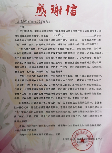 近日,植科系参与疫情防控志愿服务的学生收到来自服务单位的感谢信。