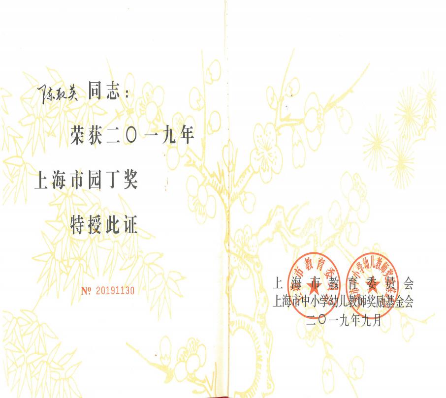2019年“上海市园丁奖”评选工作于8月底完成,经区级推荐、市级审核等程序,园林系教师党员陈取英同志荣获“2019年上海市园丁奖”。陈取英同志从2001年进入上海市农业学校担任专职教师以来,作为一名党员,牢记党员要求,践行党员标准;作为一名教师,教学上兢兢业业上好每堂课;作为一名班主任,尽心尽职做好学生的领路人;作为教研室主任,踏踏实实协调好教研室工作。