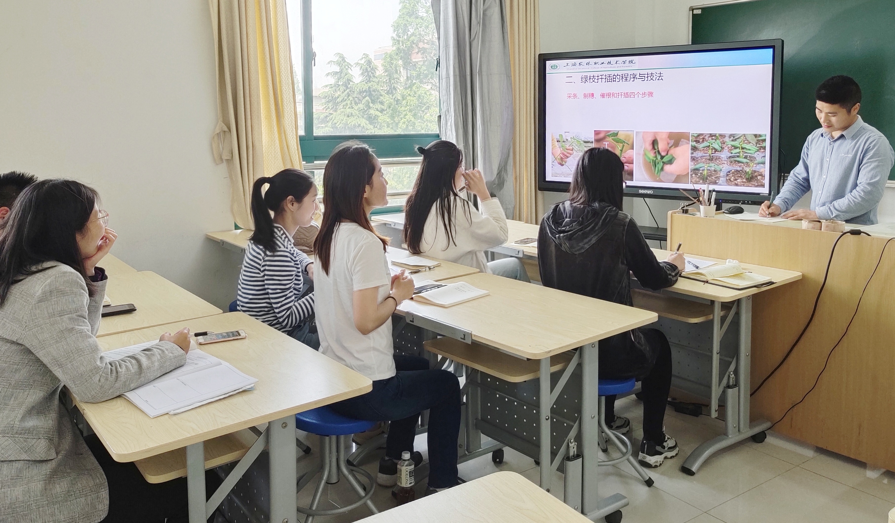 活动中,张琰结合长期参加教学比赛经验,针对如何上好一堂课,从教学分析、教学设计、教学实施、教学效果、教学特色、教学反思等方面,为青年教师指点迷津。青年教师刘林就“绿植扦插的程序与技法”内容进行说课演练,他从“选苗、制穗、催根、扦插”四个步骤,结合ppt内容和道具做了8分钟的完整片段讲解,现场为大家演绎如何选苗如何扦插,整个教学过程流畅。与会老师从教学设计、与学生互动、问题导入形式等方面进行了交流讨论,并对刘老师说课提出了修改建议,刘老师也表示将根据大家提出的建议和意见进行补充修改。