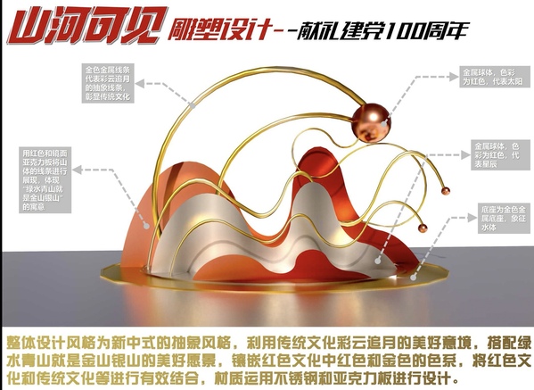 张婷作为一名党员教师以景观雕塑设计的特殊方式向建党100周年献礼。作品《山河可见》构思来源于传统文化彩云追月,融合“绿水青山就是金山银山”的经典名句,利用朴素环保的材质,彰显红色文化的色系。作品的设计愿景是应用于乡村景观,城市广场等多种场所的景观设计中,能够成为焦点型的视觉景观。通过材质的色泽和反射效果,注重光影变化和夜晚的灯光设计,将本雕塑打造成地标性的构筑物小品。