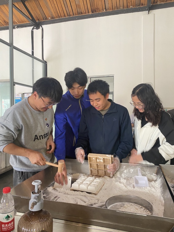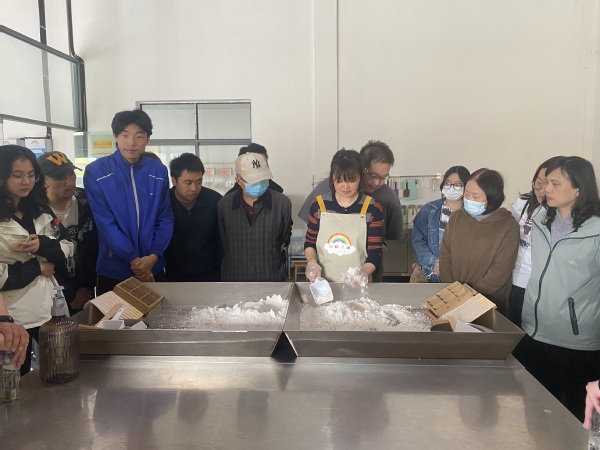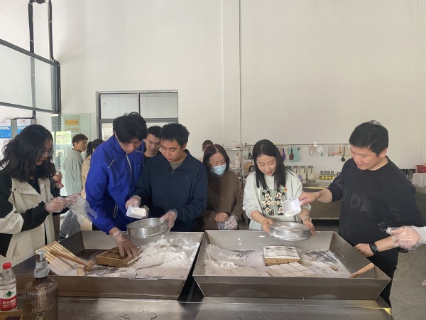 随后大家一起体验了上海市非物质文化遗产—叶榭软糕的手工制作。“松江,自古就是鱼米之乡。是咱们的松江大米,铸就了口感清爽、松软香甜、糯而不粘、甜而不腻的叶榭软糕。”在认真听取工作人员讲解软糕的故事和制作方法后,大家忙碌起来,筛粉、刮平、压坑、填馅、翻转、脱模,再隔水蒸20分钟,制作过程考验耐心和专注力,师生们相互配合和提醒,比赛脱模的成功率,现场一片欢声笑语。
