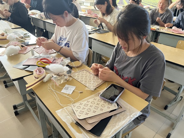 活动一经发布,就得到手工爱好者们的热烈响应。活动开始后,指导老师耐心地为同学们们讲解制作时用到的不同针法,回针缝、藏针缝、卷针缝……同学们听得津津有味、跃跃欲试。开始实践操作后,看到手中的皮料和各式各样的工具,同学们们的兴致更加高涨。在指导老师的细心引导及志愿者的帮助下,大家慢慢掌握了制作技巧。一针、两针、三针……经过四个多小时的精心制作,一个个小巧、清新的手工包新鲜出炉。不仅给同学们带来手工DIY的快乐,同时也给生活增添了不一样的色彩。制作完成的包包也成为了大家出行游玩的随身必备品。
