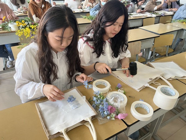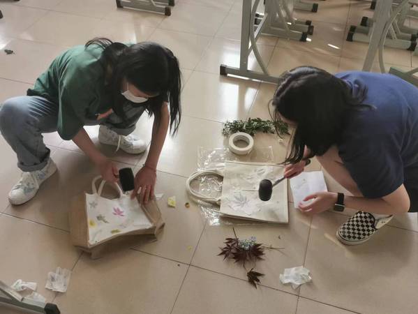 活动一经发布,受到同学们踊跃报名。活动开始前,主持人向参与同学简单的介绍拓染步骤和注意事项。随后同学们以小组形式开始制作,有的同学思如泉涌,制作的非常快;有的同学静静思考,小心翼翼不出一丝纰漏;也有的同学选料、制定方案、种植装饰,搭配各类植物颜色,随后用橡胶锤用力敲打出形,留住花叶原有的颜色纹路和形状。运用现有植物素材,在帆布包上结合各自理念,用心设计图案,每一种植物都有独特的姿态和色彩,即使同科、属、种类的植物根、茎、叶、花所拓染图案均不相同,同一植物的同一器官所产生的脉络纹理也不尽相同。