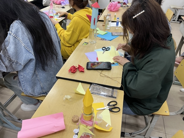 此次活动旨在弘扬传统手工精神,将手工制作与现代事物相结合,以“寓教于乐,寓学于趣”的方式,进一步激发大学生手工创作灵感和热情。活动开始后,主持人为大家讲解航天花瓶的简单做法,大家听后跃跃欲试,每个人积极展示自己的创意。有同学用塑料瓶结合圆柱状彩纸制作火箭外观和底座,有同学用易拉罐和玻璃瓶制作,更有同学在花瓶内进行插花花艺创造等,经过大家的妙手巧工,都做出了属于自己的航天环保花瓶。大家积极将自己的作品分享给别人,在一片欢声笑语中,第十届“园”创绿色科技节圆满结束。