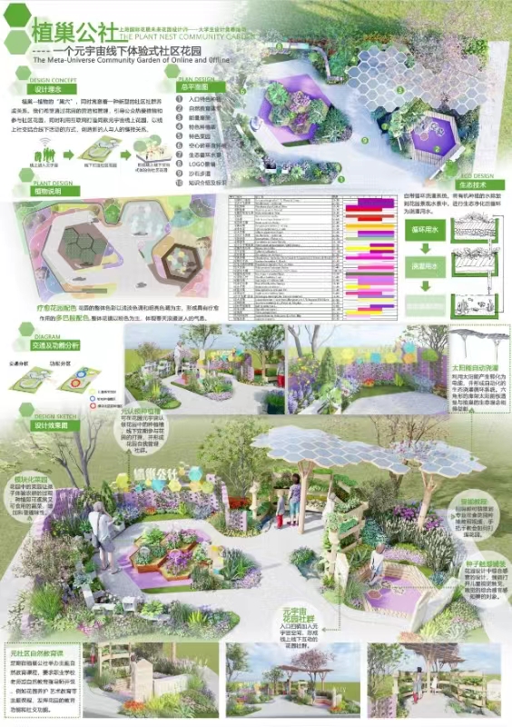 本次竞赛以“引导公众热爱植物和自然的社区花园”为命题,突出花展“满足公众园艺需求”的实施目标。《植巢公社-一个元宇宙线下体验式社区花园》设计作品通过元宇宙线上社交模式+社区花园线下参与认领的创新模式,结合生态和可持续的环保技术,探讨了一项新型社区花园设计运营模式。学生在竞赛中利用多维度开展实践应用,提升了设计表现力和实践能力。