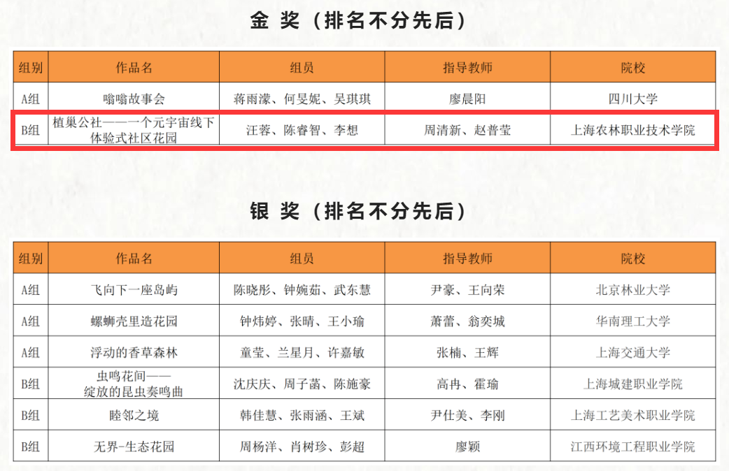 据悉,自2023年11月18日竞赛公告发布以来,比赛吸引了全国各地的学子们踊跃参与,来自全国27个省市、168所院校共计520支团队参赛。初赛由12位行业专家组成的专家团队根据竞赛要求对A组(本科及以上院校组)、B组(高职(专科)院校组)的300份作品进行了评审,最终两组各评出了16件入围决赛的作品。决赛由9位国内行业知名专家(为保证公平性,初审与终审专家不同)齐聚云端,对32件入围决赛的作品进行最终评审。植科系学生汪蓉、陈睿智、李想三位参赛选手在周清新,赵普莹指导教师的一致努力下,参赛作品《植巢公社-一个元宇宙线下体验式社区花园》获得了主办方“2024上海(国际)花展组委会和《中国园林》杂志社”的一致好评。