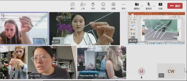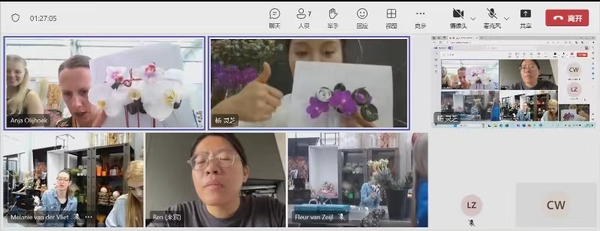 《插花艺术》国际化课程在上海市项一鸣技能大师工作室和上海市首席技师徐卓颖的指导下,由全国技术能手杨灵芝老师精心设计,植科系张微微、成文竞、赵普莹等教师承担沟通协调、课件及视频翻译等工作。课前,课程团队将课程所需花材和辅材清单发至荷兰朗蒂斯教育集团,明确开班时间。首次课上,荷兰MBO Westland 和MBO Oostland等高职院校的师生在荷兰朗蒂斯教育集团培训导师Anja Olijhoek的带领下,一起聆听杨灵芝老师的直播授课;杨灵芝首先对授课主题“花首饰-头花”进行任务导入,要求师生根据根据婚礼风格以及新娘礼服制作一款头花,在理论讲解和微课解读之后,手把手一同带领荷兰师生共同制作架构式头花,通过铝丝的弯折、叶片卷曲、花朵的串联等技法制作出精巧、灵动的头花,并最终将头花作为首饰戴在头发上。此次课程的开展,不仅为师生们提供了一个了解、学习插花技艺的平台,也让他们在云端交流中感受到了中荷之间的文化差异,荷兰师生充分感受到中国传统花艺文化之美,传播中国插花技艺。