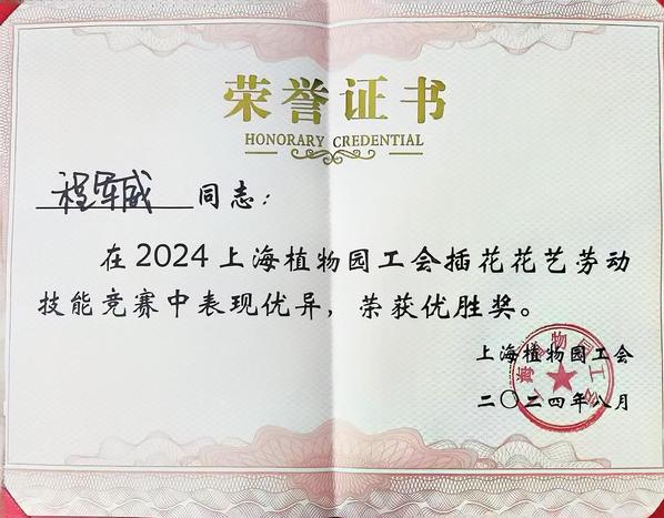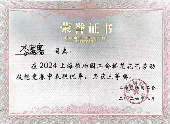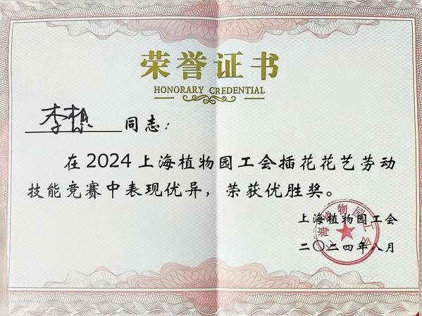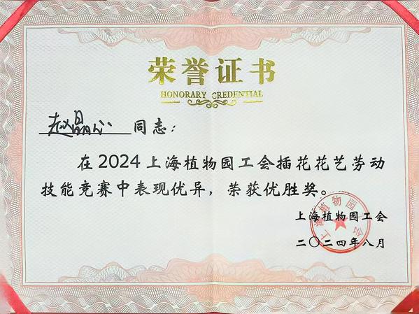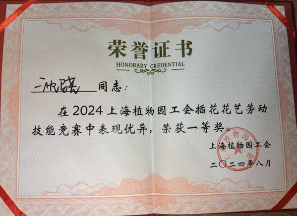近日,2024年上海市民海派插花花艺大赛(植物园专场)暨上海植物园插花花艺技能竞赛在上海植物园植物大楼顺利举办,32位选手参与了比赛。我校现代学徒制“盆景兰花班”学生沈骁荣获一等奖,李骞骞荣获三等奖,李想、赵晶心、程军威三位学生荣获优胜奖。
