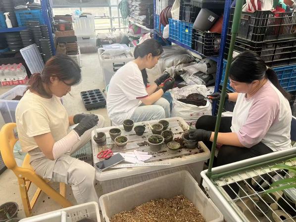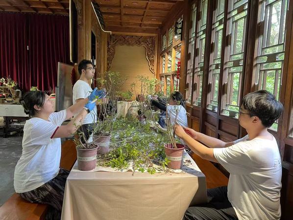 上海植物园“盆景兰花班”成立于2024年6月,共有11名学生组成,来自植物科学技术系园林技术、园艺技术、花卉生产与花艺、园林工程技术等专业。自7月至今,园方结合学生志趣和岗位需求,将学生分为三组,分别在上海植物园盆景园、兰室、温室实习。