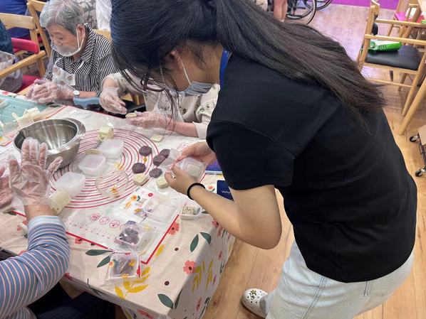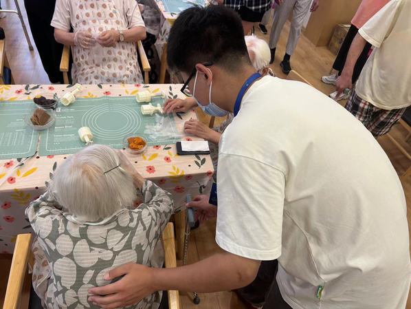 在活动现场,志愿者们耐心地指导老前辈们揉面团、包馅、压模,每一个细节都体现了他们对福利院老前辈们的尊敬和关爱。老前辈们也在志愿者的帮助下,兴致勃勃地完成了自己的月饼作品,脸上洋溢着幸福的笑容。