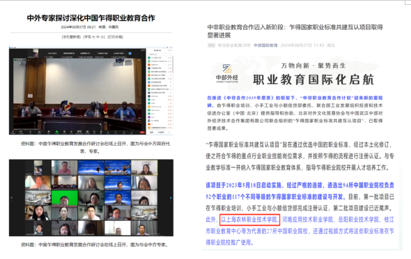 自该项目立项以来,学院专门成立项目开发组,积极参加“中乍职业教育发展合作研讨会”,开展多次调研和专家研讨,撰写了乍得国家职业标准(农作物植保员3级)及配套专业标准。为更好的输出标准,助力乍得共和国职业标准和专业标准有效实施,培养更多农作物植物保护相关技能人才,项目开发组在完成专业标准和职业标准开发的基础上,录制了职业技能宣传推广使用视频,目前已在乍得共和国恩贾梅纳职业技术培训学校等2所农业类院校推广使用30余人次,得到乍得国家教育主管部门高度评价,并被有关媒体宣传报道。