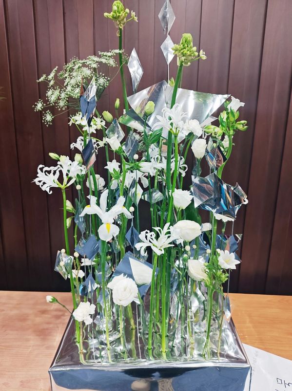上海市民海派插花花艺大赛是上海绿化节的重要活动之一,至今已举办九届。自5月10日在徐汇滨江召开启动仪式以来,历经5个多月,到10月26日的总决赛,培训40场,比赛29 场,参加培训、比赛人次达到2303人次,为历届最高,包括今年6月在我院举办的松江赛区选拔赛。总决赛由自选作品和神秘箱作品两个模块构成,自选作品开放度高,所有材料由选手自带,考验选手对海派插花创作的熟练度与速度。神秘箱作品的主题为“房间装饰”,其“神秘”之处是,以衣帽架为载体,制作一个“梯态”作品,花材、花器都由主办方统一提供,选手不能添加任何其他花材,考验选手的临场应变能力。陈睿智的自选作品主题为“镜映东方”,用多个镜面贴衬出在繁花世界里不同角度的东方明珠。