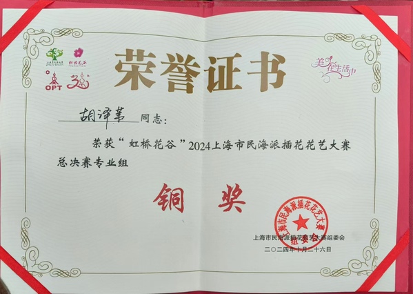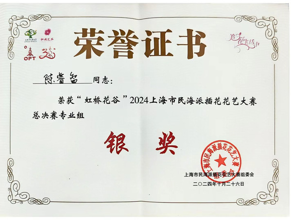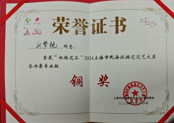 10月26日,2024上海市民海派插花花艺大赛总决赛颁奖大会在上海东方明珠电视塔举行,我院花艺221班陈睿智荣获专业组银奖,花艺231班胡译苇、刘梦艳荣获专业组铜奖。总决赛分为专业组和市民组,其中专业组总决赛于10月25日在世纪公园举行,从33名参赛选手决出金奖1人、银奖2人、铜奖3人,我院学生占获奖总人数的50%。植科系副主任成文竞、名师工作室成员带队参加颁奖大会。