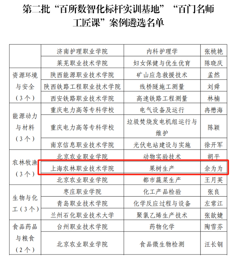 6月16日,中国职业技术教育学会发布《关于第二批“百所数智化标杆实训基地”“百门名师工匠课”案例遴选结果的公示》(职教学会秘〔2025〕38号)。植物科学技术系佘为为老师主持的《果树生产》课程经过严格评审,成功入选全国67门“名师工匠课,成为农林牧渔专业大类全国仅有的3门获评课程之一。这一成果充分体现了植科系在职业教育数智化转型和内涵建设方面取得的显著成效。
