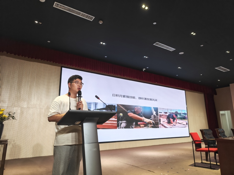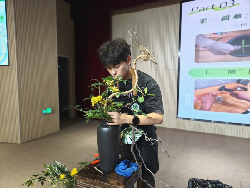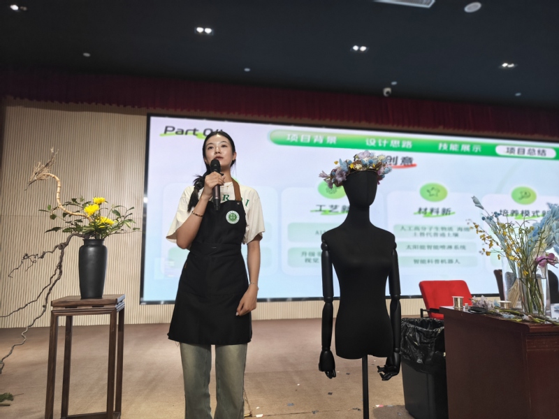 随后,各赛道的师生代表依次上台分享,为新生呈现了一场精彩的“技能盛宴”。首位登场的是刚刚在世校赛林业赛道高职组荣获银奖的优秀选手吴子俊和梯队选手吴梦倩。他们不仅现场展示了获奖作品,包括造型雅致的传统插花与创意十足的人体装饰花艺,还在作品制作过程中细致讲解了灵感来源、设计思路及核心技能要点。最后,两位选手以“学长”身份分享了备赛训练中的难忘经历与心得体会,真挚的讲述引起台下新生的强烈共鸣。当提及未来花艺项目的招新计划时,现场反响热烈。